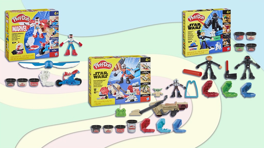 Táto súprava obsahuje niekoľko foriem a štyri mini balenia modelovacej hmoty Play-Doh, ktoré sú dostupné v zelených, čiernych, bielych, ako aj v červeno-modrých zmiešaných farbách. Deti môžu pomocou priložených foriem vytvoriť Play-Doh plášť pre figúrku Darth Vadera, vytvoriť opasok pre Lukea Skywalkera, vytvarovať Play-Doh "svetelný meč" a dokonca si vytvoriť vlastného mäkkého R2D2. Táto kreatívna hra poskytuje deťom príležitosť ponoriť sa do sveta Star Wars, zatiaľ čo rozvíjajú svoju zručnosť a predstavivosť. Kombináciou rôznych farieb a tvarov sa pred nimi otvárajú nekonečné možnosti na vytváranie nových dobrodružstiev v galaxii.Táto súprava obsahuje figúrku Sama Wilsona ako flexibilného Kapitána Ameriky. Deti môžu figúrku pripevniť k motorke (jeho ruky sa dokonca pripoja k riadidlám), motorku môžu posúvať cez farebnú Play-Doh, aby vytvorili hviezdy, a môžu s ňou aj rezať! Deti môžu tiež použiť formy na vytvorenie zloduchov alebo pripojiť 2 v 1 krídla ku Kapitánovi Amerikovi.