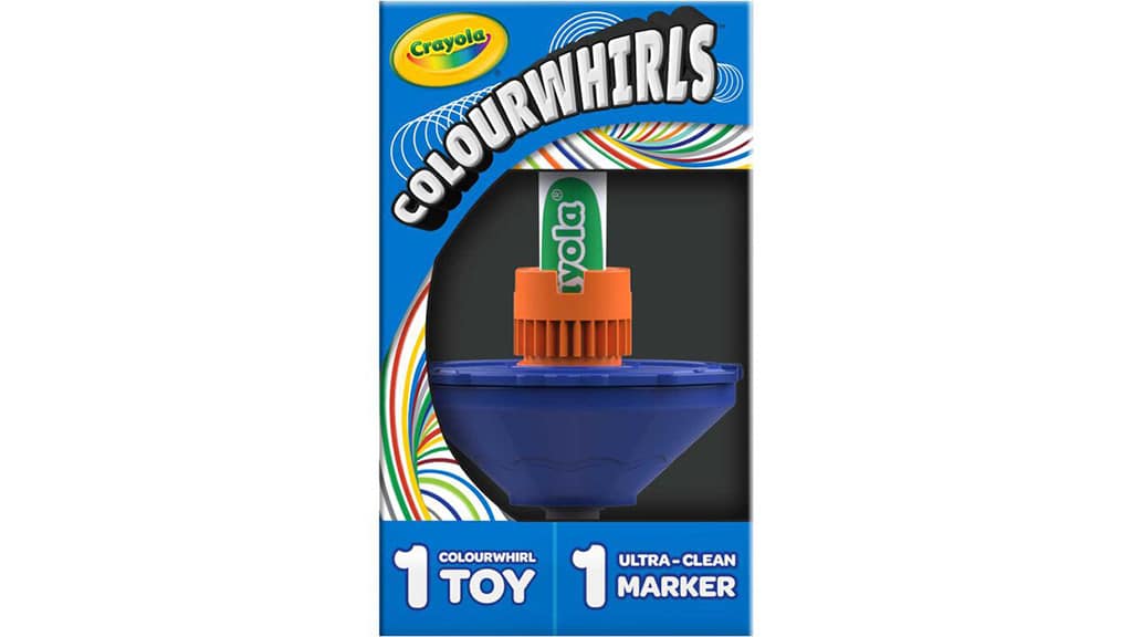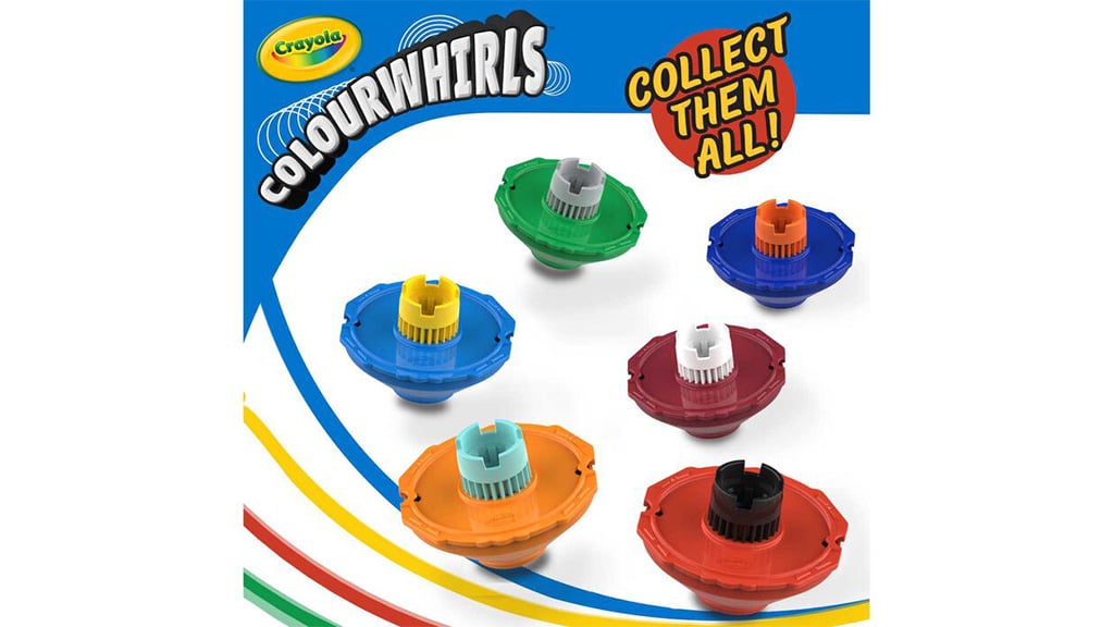 Colourwhirls posúva zábavu na novú úroveň v typických umeleckých a remeselných súpravách. Predtým, než sa zábava začne, deti si môžu prispôsobiť svoje točidlá s opakovane použiteľnými vrchnými diskami, ktoré sú skvelé pre umelecké vyjadrenie. Hoci trojbalenie obsahuje tri ultra-čisté fixky, deti môžu použiť takmer akékoľvek fixky Crayola, ak pridajú adaptér skrytý v rukoväti. Tieto súpravy sú tiež vynikajúce na hranie, pretože deti môžu používať vrchné disky na klasickú točivú zábavu aj bez fixiek. S 12 farbami točidiel Colourwhirls môžu malí umelci vytvárať špirálové umenie s akoukoľvek kombináciou vrchných diskov a diskov.