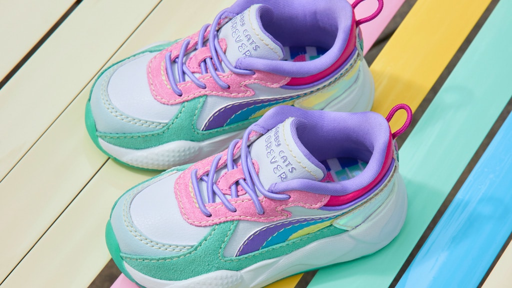 K dispozícii sú tri rôzne dizajny topánok. Deti môžu nosiť biele topánky s farebnými škvrnami, ružovými šnúrkami a ikonami Cakey Cat. K dispozícii je aj pár ružovo-krémových topánok s ružovou, trblietavou podrážkou a odtlačkom labky. Ak hľadáte topánky so srdcovým posolstvom, sú tu pastelové topánky s nápisom Tabby Cats Forever na jazyku!