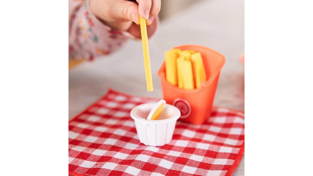 Deti budú milovať, ako si filcové hranolky namáčajú do omáčkového pohárika, ktorý sa strieda medzi horčicou a kečupom v súprave Pretendables Burger a Fries. Táto hračka nie je len zábavná, ale rozvíja aj detskú predstavivosť a jemnú motoriku. Možnosť prepínať medzi rôznymi omáčkami dáva deťom príležitosť predstaviť si rôzne chute a textúry, zatiaľ čo počas hry kreatívne formujú svoj vlastný malý svet.