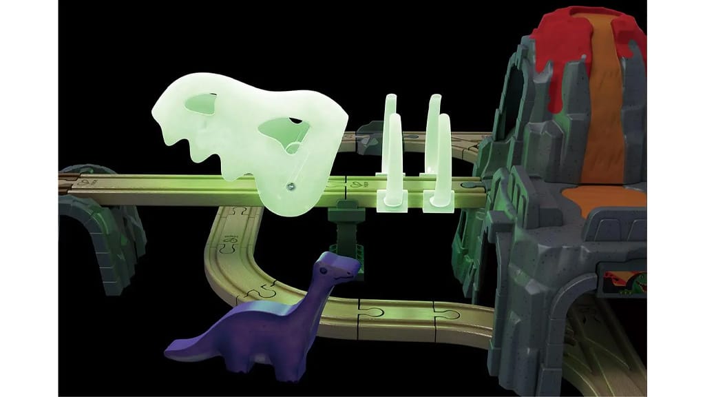 Hape Dino Kaland Železničná súprava obsahuje 23 bukových koľajníc, figúrky dinosaurov a všetky potrebné doplnky pre konečnú jurskú vlakovú cestu. Deti môžu postaviť veľkú trať a viesť drevený vlak cez sopku, dinosaurie rebrá, lebku dinosaura a mnoho ďalších prekážok. Malí môžu umiestniť dinosaury, žeriavy, stromy, kryštály a mnoho ďalších prvkov okolo súpravy, aby vytvorili skutočne pútavý zážitok. Táto hra nie je len zábavná, ale rozvíja aj kreativitu a zručnosť detí, zatiaľ čo sa zoznamujú so svetom dinosaurov. Súprava dáva deťom možnosť vymýšľať vlastné príbehy a ponoriť sa do jurských dobrodružstiev, zatiaľ čo kombinujú a znovu vytvárajú trať s rôznymi prvkami. Počas hry sa deti môžu naučiť aj tímovú prácu, ak spoločne stavajú trať a delia si úlohy. Táto železničná súprava je perfektnou voľbou pre každého malého objaviteľa, ktorý miluje dinosaury a vlaky.