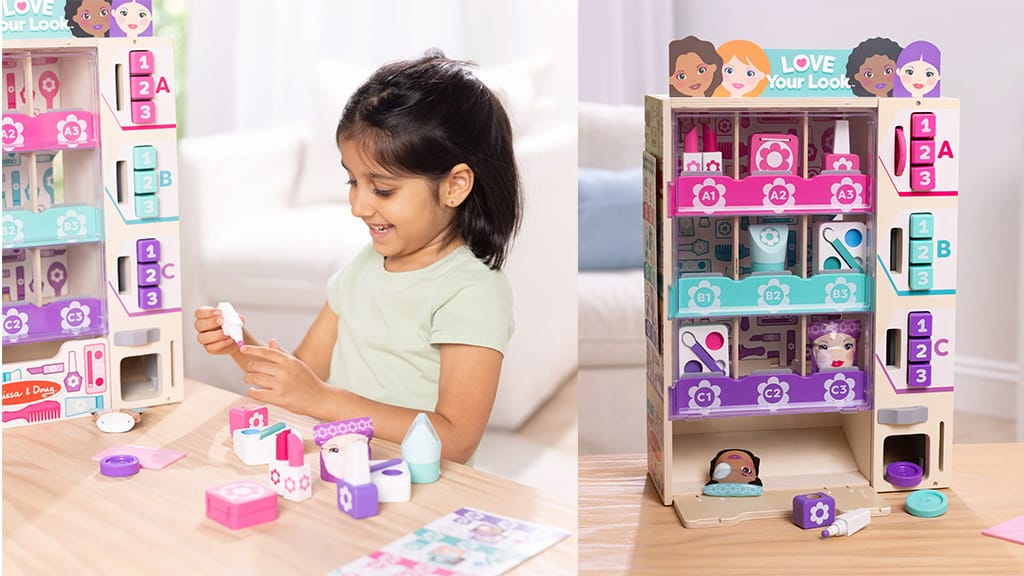 Melissa & Doug teraz úplne obnovuje svoju veľmi obľúbenú súpravu hračiek Vending Machine! Tento set, ktorý napodobňuje predajný automat, bol už doteraz obľúbený u mnohých detí, teraz sa však vracia v ešte vzrušujúcejšom, farebnejšom a detailnejšom prevedení. Vďaka vylepšeniam môžu deti zažiť ešte realistickejšie zážitky, pričom hravou formou sa učia o používaní peňazí, nakupovaní a situáciách každodenného života. Cieľom spoločnosti Melissa & Doug je priniesť radosť z kreatívnej hry do každej rodiny a nová verzia súpravy Vending Machine je na to dokonalou voľbou!Zoradiť, naplniť a vybrať! Sada hry Beauty Kiosk kombinuje imaginárnu hru s dôležitými rozvojovými zručnosťami, ako je párovanie, počítanie a rozpoznávanie písmen. Nový automat nevydáva pochutiny, ale drevené kozmetické produkty, ktoré si deti môžu usporiadať a uložiť na poličku. Od kontroly zásob až po vytváranie imaginárnych mejkapov sa rozvíja sebavedomie a myslenie detí, pričom môžu ukázať svoj vnútorný lesk. Táto hra nie je len zábavná, ale podporuje aj rozvoj sociálnych zručností a jemnej motoriky, zatiaľ čo sa deti učia a tvoria pri hraní rolí.