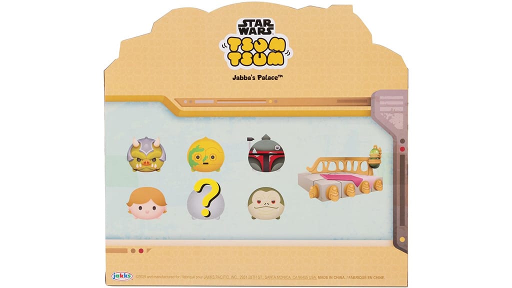 JAKKS Pacific Star Wars Tsum Tsum Jabba Palác Deluxe Sada je navrhnutá pre mladých, intergalaktických fanúšikov, ktorí milujú túto franšízu. Tieto malé figúrky sú inšpirované filmom Star Wars: Návrat Jediho, vrátane kľúčového momentu, keď Luke Skywalker bojuje s Jabbom, Huttom. Sú malé, ale silné, a medzi figúrkami v sade nájdete veľkého Bobu Fetta (3,8 cm), veľkého Jabbu, Hutta, stredného C-3PO (2,5 cm), malého Gartogga (1,3 cm), malého Lukea Skywalkera a jednu prekvapivú postavu. Sada obsahuje aj veľký doplnok, trón Jabbu, Hutta. Krabica na hračky zároveň slúži ako zberateľská vitrína.