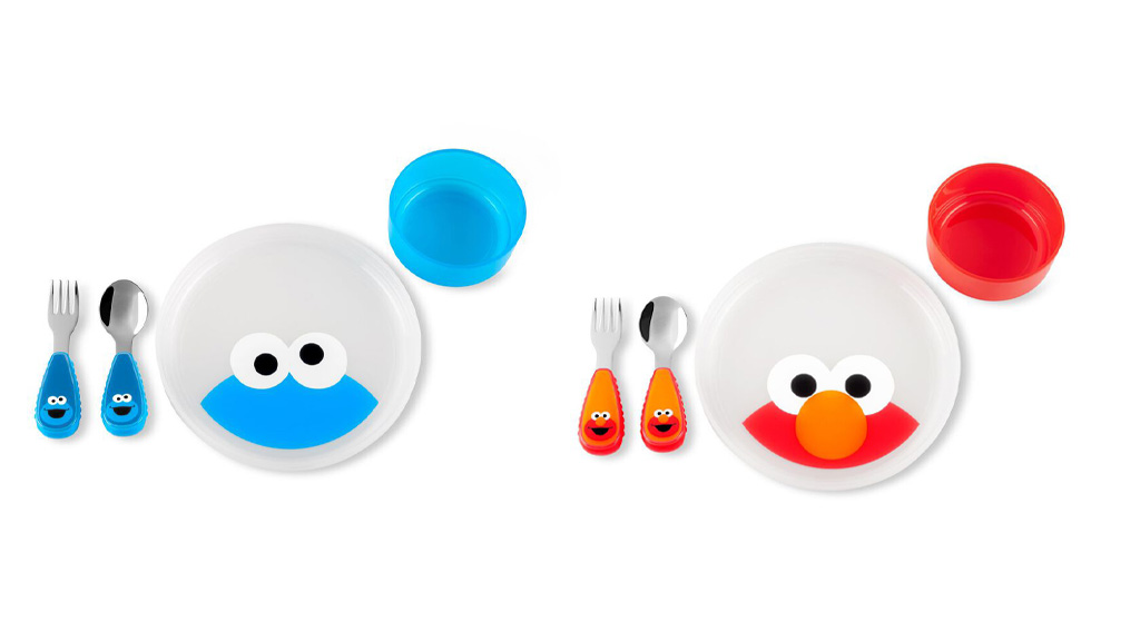 BPA-free snack poháre majú ľahko uchopiteľné rukoväte, zacvakávacie viečka, ktoré udržujú jedlo čerstvé, nepretekajúce otvory a obsahujú 7,5 unce. Sú dostupné v troch dizajnoch: Elmo, Cookie Monster a Abby Cadabby.Každá jedálenská súprava obsahuje tanier, misku, vidličku a lyžicu. Tanier a miska sú **vhodné do mikrovlnnej rúry** a majú **protišmykové** dno. Vidlička a lyžica z nehrdzavejúcej ocele majú **ľahko uchopiteľné** strany. Súpravy **bez BPA a PVC** sú dostupné v dizajnoch **Cookie Monster** a **Elmo**.