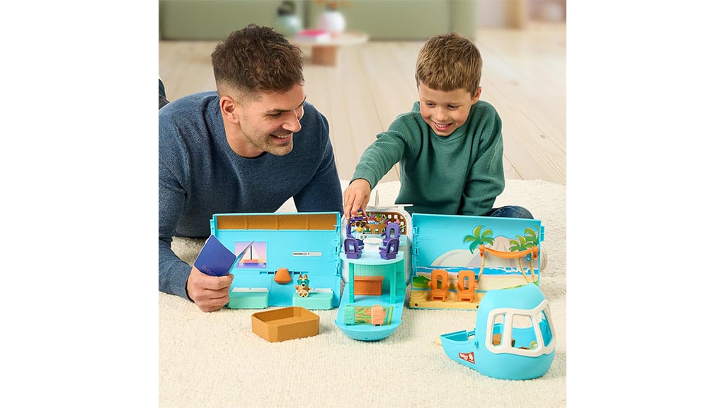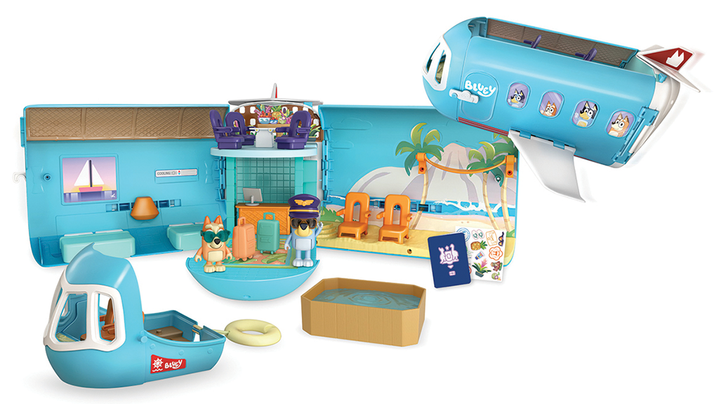 Navrhnuté pre deti od 3 rokov, táto hracia súprava Bluey vezme deti na tropické dobrodružstvo s tromi hernými režimami: lietadlom, loďou s pripojeným plávacím kruhom a letoviskom, ktoré obsahuje štvorlôžkovú hotelovú izbu a pláž! Súprava obsahuje aj dve exkluzívne figúrky – Bluey s pilotnou čiapkou a slnečnými okuliarmi a Bingo so slnečnými okuliarmi – s ktorými môžu deti prehrávať scény. Keď deti stlačia tlačidlo na zadnej strane hracej súpravy, prehrá viac ako 25 rôznych zvukov, fráz a hudby zo šou. Deti sa môžu skutočne zúčastniť dobrodružstva s austrálskym pasom, ku ktorému patrí aj nálepka na ozdobenie!