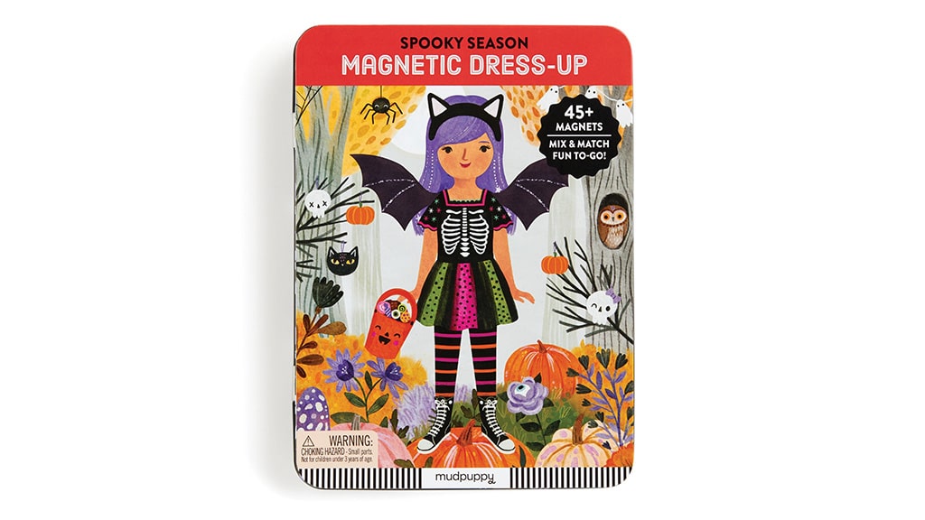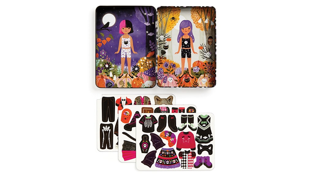 Malé deti si môžu rozvíjať svoje jemné motorické zručnosti s touto štvordielnou, drevenou puzzle súpravou. Každé puzzle zobrazuje roztomilé tvory a halloweenske motívy, čím vnáša do hry veselú, no zároveň tajuplnú atmosféru. Tieto skladačky nie sú len zábavné, ale pomáhajú aj pri rozvoji zručnosti rúk, schopnosti riešiť problémy a pozornosti, pričom deti spoznávajú čarovný svet Halloweenu.Deti si môžu vytvoriť jedinečnú halloweensku módu s viac ako 45 kombinovateľnými a párovateľnými magnetickými prvkami. Táto sada v kovovej krabičke obsahuje tri hárky magnetických nálepiek a dva pozadia, na ktorých sa nachádzajú postavičky a prezliekateľné kostýmy. Deti môžu voľne kombinovať rôzne kusy oblečenia a doplnky, takže zakaždým môžu vytvoriť nové, kreatívne zostavy. Táto hra nielen rozvíja predstavivosť a jemnú motoriku, ale poskytuje aj skvelú zábavu počas obdobia Halloweenu alebo po celý rok.