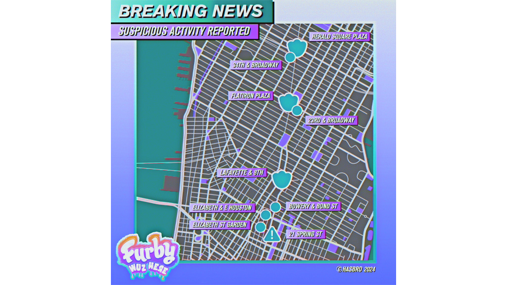 Kampaň sleduje Furbyho, ako "furbizuje" veci, ktoré sa mu dostanú do cesty! Zdroj: HasbroMôžeš sledovať túto mapu, alebo hľadať predmety pokryté srsťou a veľké stopy Furbyho. Zdroj: HasbroTo zahŕňa obrovské Furbyho stopy, farbu a trblietky na chodníkoch, ako aj predmety pokryté srsťou. Deti môžu sledovať Furbyho stopy a nájsť chlpaté lampové stĺpy, bicykle, bóje, lavičky a novinové stánky, ktoré sú výsledkom Furbyho transformačných schopností. Tieto predmety a fotografické príležitosti sa nachádzajú na Herald Square Plaza, Astor Place Plaza, Elizabeth Street Garden a na iných miestach v meste. Návštevníci sú povzbudzovaní, aby pri zverejňovaní fotografií a videí online používali hashtag #FurbyWuzHere.