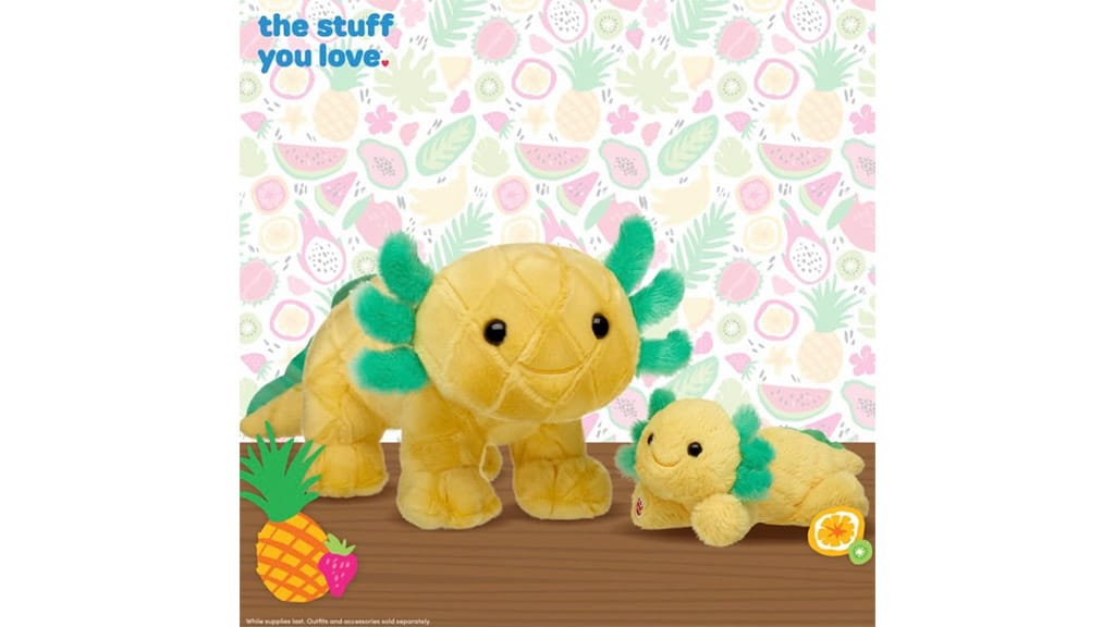 Cestuj na trópy s pomocou Pineapple Axolotl! Táto výnimočná plyšová hračka ti prináša letnú atmosféru a tropickú radosť. Farebný a jedinečný axolotl, ktorý je dostupný v ponuke Build-A-Bear, je dokonalou voľbou pre všetkých, ktorí milujú exotické zážitky a výnimočné hračky. Prekvap seba alebo svojich blízkych týmto veselým, ananásovým axolotlom a užívaj si tropické dobrodružstvá v pohodlí svojho domova!
