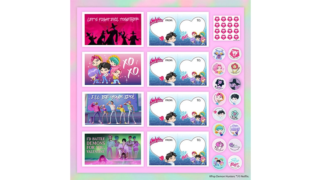 Tento rok na Valentína môžu deti zdieľať svoju vášeň pre obľúbené kapely prostredníctvom pohľadníc s témou K-Pop Démonvadászok. Tieto balíčky sú dostupné v dvoch štýloch, HUNTR/X a Saja Boys, a obsahujú 16 skladacích valentínskych kariet s milými odkazmi, ktoré sú ideálne pre malých fanúšikov.