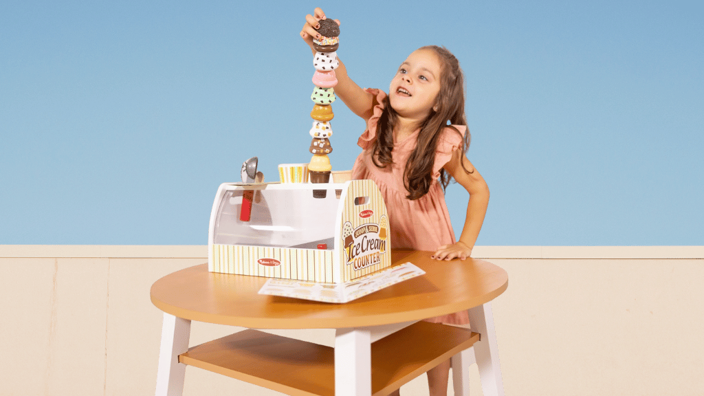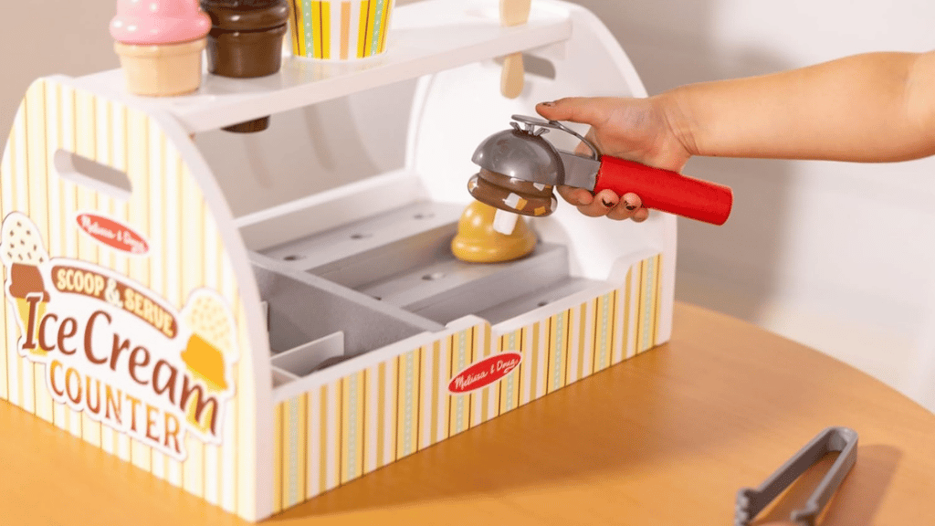 Ponorte sa do sladkého sveta hrania rolí s pomocou **Melissa & Doug Scoop and Serve Ice Cream Counter**! Táto rozkošná súprava obsahuje robustný drevený pult, ktorý je vybavený všetkým, čo deti potrebujú na prevádzkovanie vlastného **zmrzlinového obchodu**. Od ôsmich rôznych príchutí zmrzlinových kopčekov, cez polevy, kornútky a servírovacie nástroje, táto súprava podporuje **kreativitu** a spoločenskú hru. Malí môžu prijímať objednávky na opakovane použiteľnej menu karte, naberať a vrstviť zmrzlinu a objavovať imaginárne **scenáre hrania rolí**.