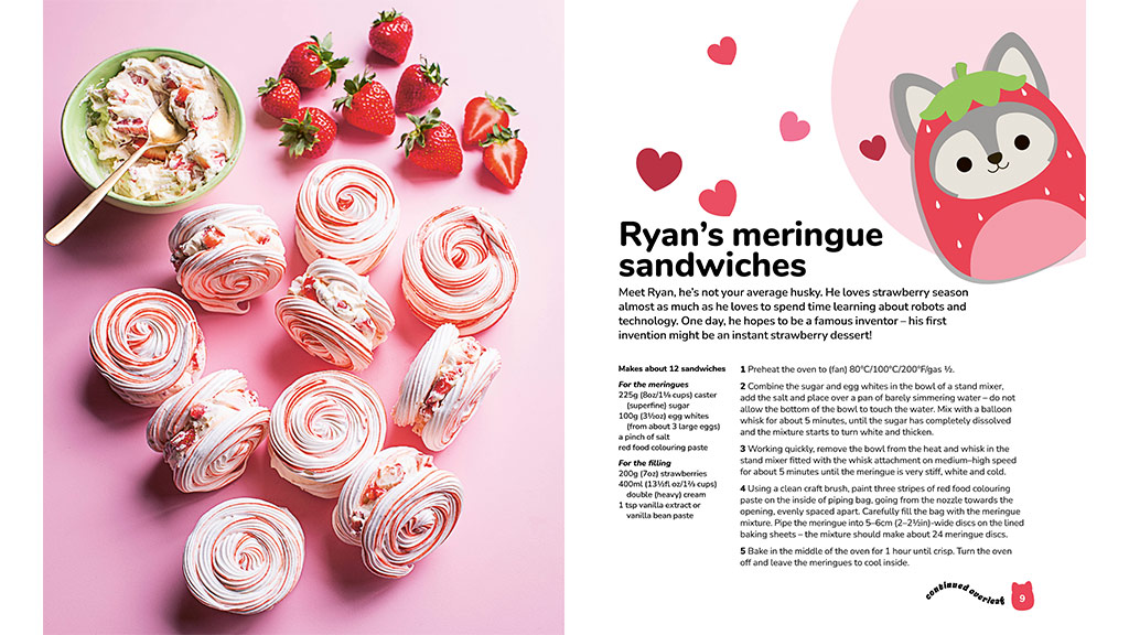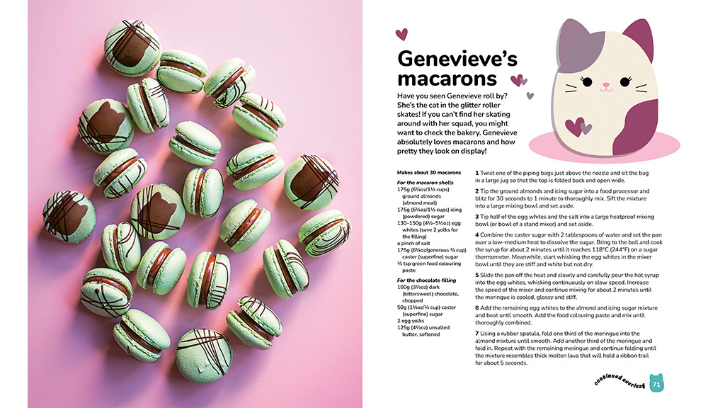 Squishmallows: Oficiálna kuchárska kniha obsahuje 50 receptov inšpirovaných Squishmallows, ktoré môžu deti pripraviť spolu s rodičmi. Medzi receptami nájdete pečivo, torty, sušienky, cukrovinky a nápoje, ktoré môže celá rodina pripravovať po celý rok. Kniha je neodolateľná, pretože obsahuje lákavé fotografie všetkých receptov, ktoré deťom rozbehnú sliny v ústach. Medzi jej vynikajúce recepty patria Camove trojfarebné cestovinové sušienky, Hansove čokoládové lanýže s posýpkou, Lesediho škoricové slimáky, Bethanyho Linzer srdiečkové sušienky, Macove tekvicové korenené whoopie koláče a mnoho ďalších!