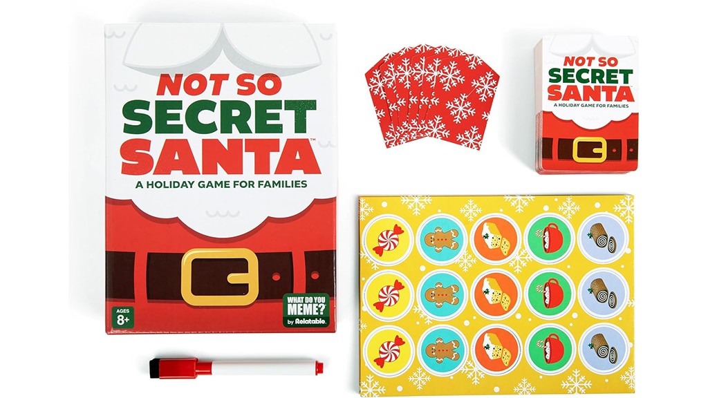 Hráči môžu darovať rôzne výzvy svojim protivníkom v vianočnej tematickej hre Not So Secret Santa. Táto hra poskytuje príležitosť kreatívnym a zábavným spôsobom otestovať našich priateľov a rodinných príslušníkov, pričom zároveň zvyšuje sviatočnú atmosféru. Výzvy môžu byť jednoduché alebo zložité, v závislosti od toho, ako veľmi chceme sťažiť úlohu druhému. Takéto typy hier nie sú len zábavné, ale tiež pomáhajú posilňovať spoločenské vzťahy, pretože spoločné zážitky a smiech približujú ľudí k sebe.Relatable sviatočné tematické hry sú ideálne na rodinné a priateľské stretnutia (Merry Dissmas je stále jedným z najväčších hitov na sviatkoch mojej rodiny) — a táto hra je zaručený úspech. Vyhnite sa hádkam a trápnym rozhovorom s trochou priateľskej súťaživosti … a trochou hravého doberania. Navyše darčekové štítky a karty sú rozkošne roztomilé s dizajnom Santa Clausa a darčekových štítkov.