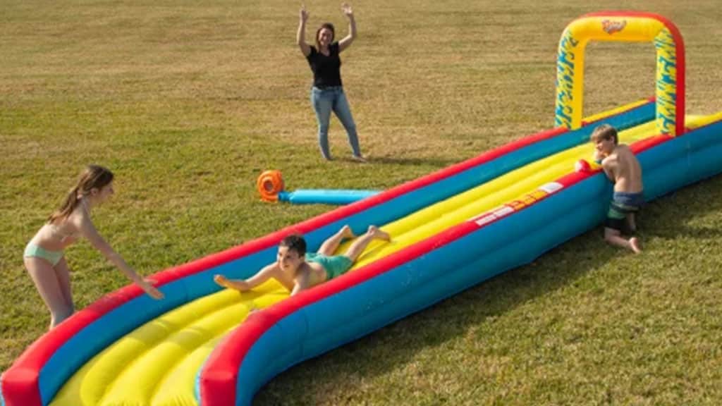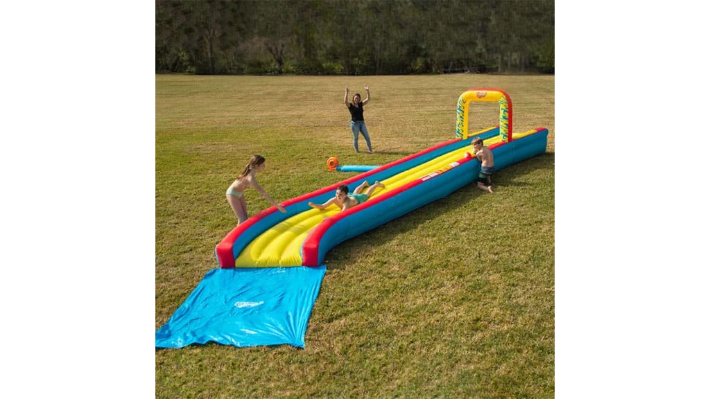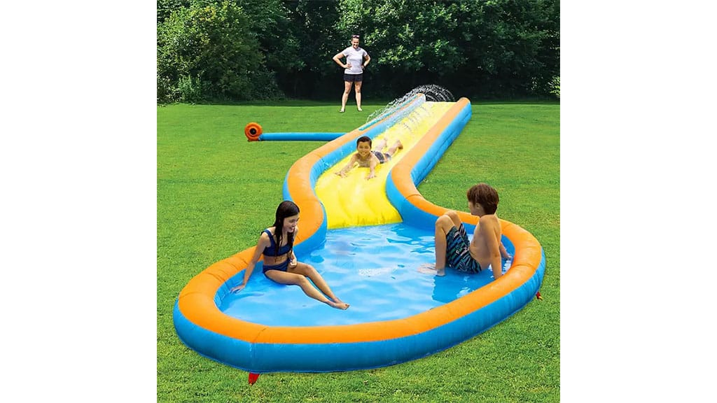 Rodiny sa môžu o ďalších informáciách dozvedieť na nasledujúcom odkaze. Informácie sú už teraz dostupné, takže včas nájdu vhodnú trávnatú plochu, ktorú môžu obetovať ešte pred začiatkom letnej zábavy! Nezmeškajte príležitosť pripraviť sa a s radosťou sa pustiť do letných programov, pretože spoločné zážitky a čas strávený v prírode prinášajú každej rodine nezabudnuteľné spomienky.Tento Wham-O Slip N Slide tobogán je dlhý 30 stôp (približne 9 metrov) a pomocou priloženej pumpy ho možno nafúknuť za okamih. Súčasťou je vodné delo a vzduchom odpružený povrch, ktorý poskytuje extra pohodlie a bezpečnosť počas šmýkania. Je ideálnou voľbou na letnú zábavu, pretože chladivé a veselé chvíle si môžu v záhrade alebo vonku užiť deti aj dospelí. Tobogán je vyrobený z odolného materiálu, takže je spoľahlivý aj pri dlhodobom používaní a ľahko sa udržiava v čistote.