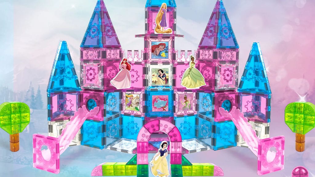 Disney Princezné Magnetická Dlaždicová Obrovská Zámková Sada (99,99 dolárov) obsahuje celkovo 167 dielov, medzi ktorými nájdete priehľadné ružové, modré a biele magnetické dlaždice. Súprava ďalej obsahuje 3D dlaždice, šmykľavky a jednu loptu. V sade sa nachádzajú aj magnetické dlaždicové figúrky Moany, Rapunzel a Ariel, ktoré sú pripravené priniesť trochu Disney kúzla do hry a STEM (vedeckej, technologickej, inžinierskej a matematickej) zábavy.