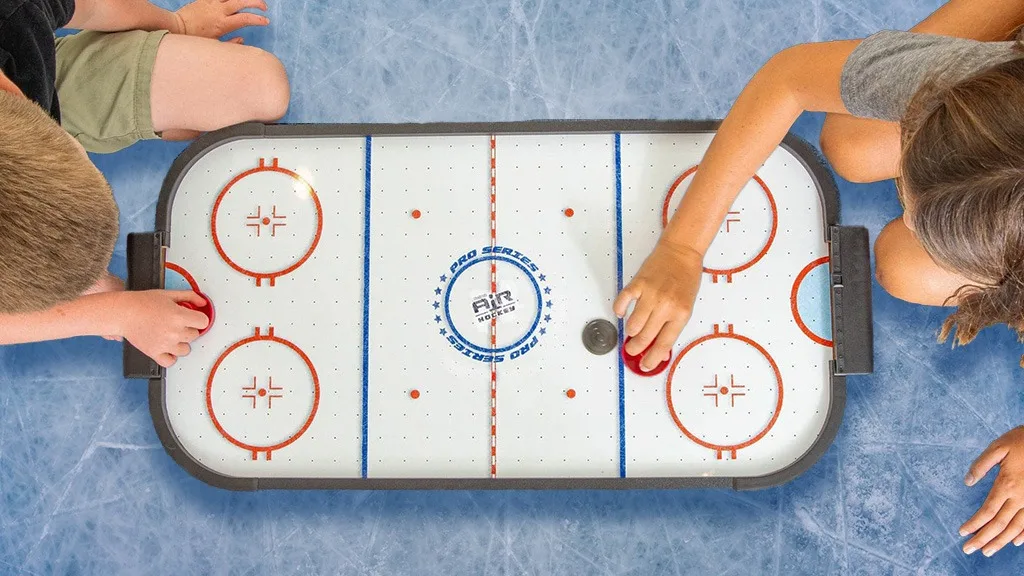 Hra má stôl s návrhom ľadovej plochy, s predinštalovaným ventilátorom pre hladký priebeh hry a ľahko uchopiteľnými pukmi. Deti vo veku 6 rokov a staršie môžu zlepšiť svoje jemnomotorické zručnosti a rozvíjať sociálne zručnosti hraním tejto klasické hry s priateľmi a rodinou. Predmontovaný stôl je ideálny pre mobilnú zábavu a môže sa hrať na akomkoľvek rovnom povrchu.