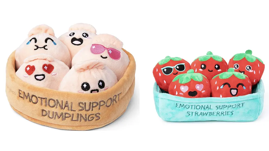 Každým obľúbené pohodlné jedlo, teraz vo forme plyšu! Tieto očarujúce plyšové figúrky jedla vyzerajú presne ako skutočné. Sú mäkké, vtipné a jednoducho roztomilé. Od šťastných až po smutné, od smiechu až po hnev, plyše Emotional Support sú teraz dostupné vo forme Kuracie Nuggety, Knedle a Jahody.