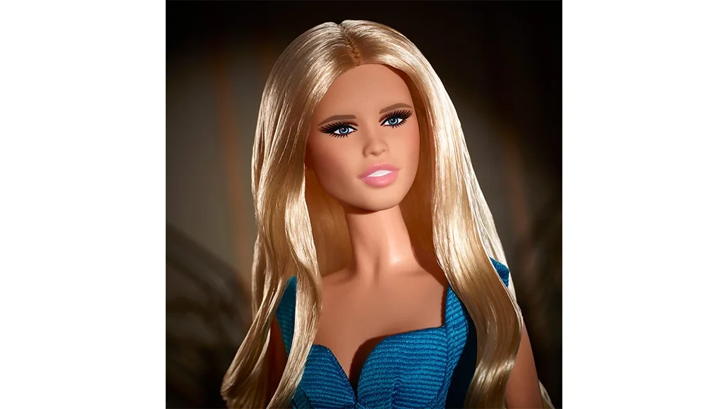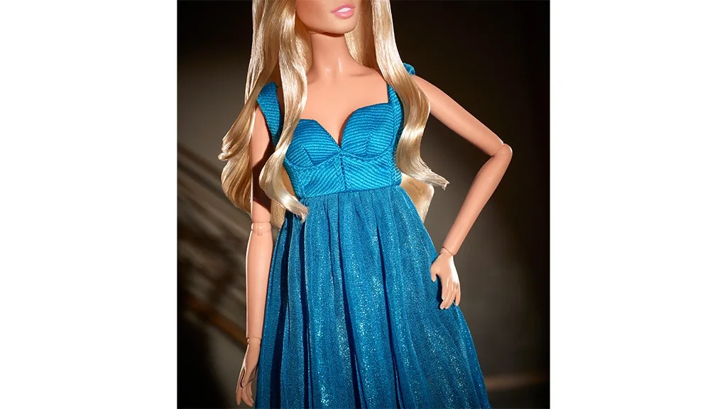 Bábika pripomína ikonický moment z móla Schifferovej z jesennej/zimnej prehliadky Atelier Versace z roku 1994. Morská modrá, až po zem siaha šaty sú éterické a z každého uhla jemne trblietavé. Vzhľad je dokonale doplnený príslušnými vysokými podpätkami, jej slávnymi blond prameňmi a jemným líčením.