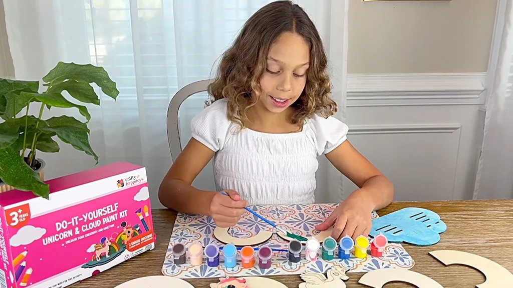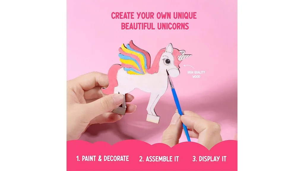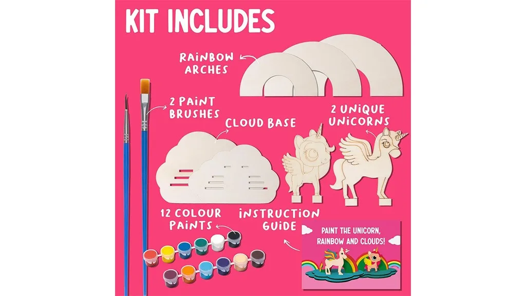 Táto sada obsahuje všetky potrebné nástroje, aby deti mohli vytvoriť kúzelné výtvory, vrátane jednorožca diorámy, 12 nejedovatých farieb na maľovanie a dva štetce – jeden plochý a jeden pre detaily. Deti môžu ozdobiť svoje jednorožce a vystaviť roztomilé dekoračné kúsky s týmto bezstresovým, bez obrazovky maľovacím setom.