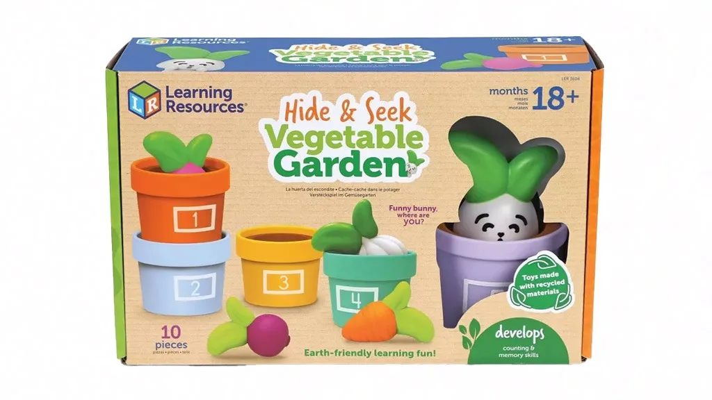 Hádanky a Zeleninová záhrada je sada 10 hier, ktorá motivuje deti cvičiť počítanie, hromadenie a triedenie. Obsahuje päť pastelových, číslovaných kvetináčov a gumové zeleniny, vrátane strúčika cesnaku, oranžovej mrkvy, cvikly a reďkovky. Deti môžu tiež nájsť priateľa v piatom kvetináči: Veselého zajaca!