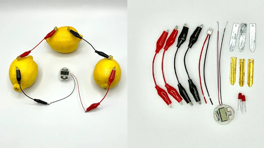 Sada na experimentovanie s elektrinou Lemon Electricity STEM obsahuje štyri krokodílie svorky, tri kusy medi, tri kusy zinku, jeden kábel s lampou, dve žiarovky a jeden hodiny. Mladí vedci môžu pomocou sady objaviť, ako môžu vytvoriť elektrinu z citrónov.