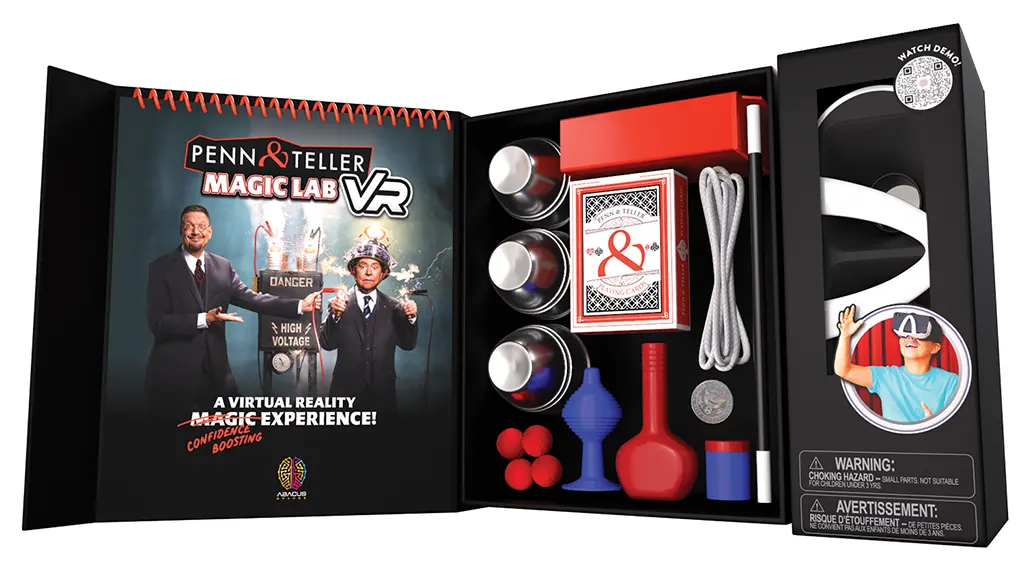 Viac ako 40 rokov Penn & Teller ako majstri ilúzie uchvátili publikum. Ale za ilúziou a kúzlom sa skrýva talent, ktorý väčšina ľudí nikdy nezohľadní, a to môže byť späté so schopnosťami, ktoré sa deti môžu naučiť a osvojiť si.Penn & Teller’s Magic Lab VR je najnovšia inovácia od spoločnosti Abacus Brands, ktorá je priekopníkom v oblasti súprav virtuálnej a rozšírenej reality (VR & AR), ktoré vzdelávanie robia zábavným a atraktívnym. S týmto 75-dielnym kúzelníckym setom sa deti môžu naučiť 28 rôznych trikov, zatiaľ čo objavujú svoje skryté talenty a budujú svoje sebavedomie, sebaistotu a schopnosti verejného prejavu.