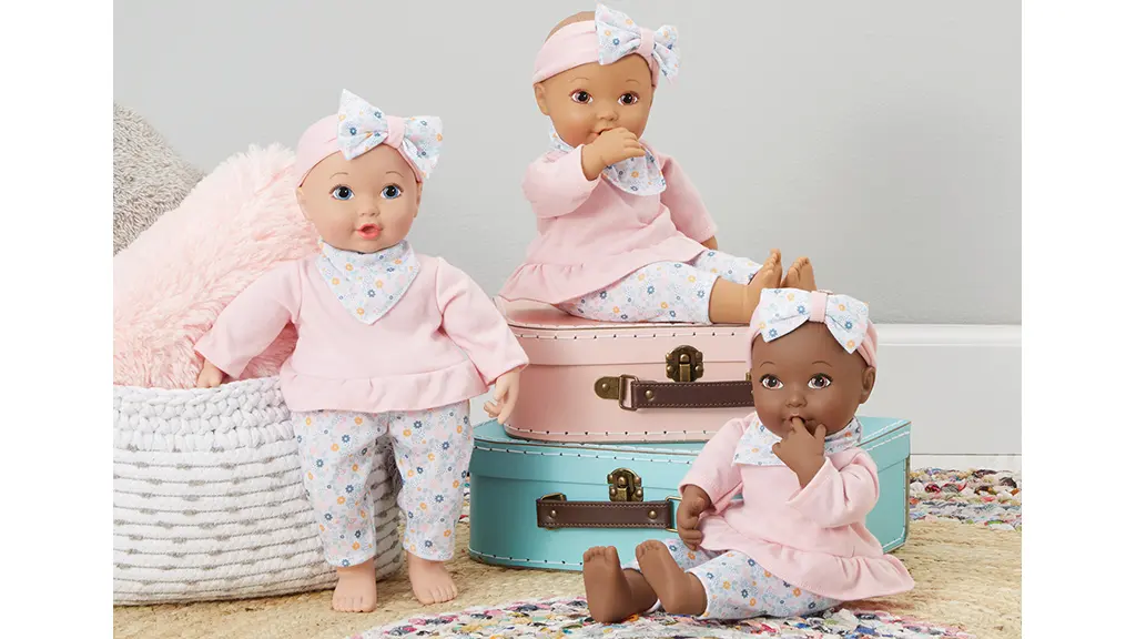 Táto 13-palcová bábika s mäkkým telom je dostupná v troch odtieňoch pleti a prichádza v kvetinových šatách, s čelenkou a zástavkou. Umiestnite ukazovák alebo palec bábiky do jej úst a zostane tam.