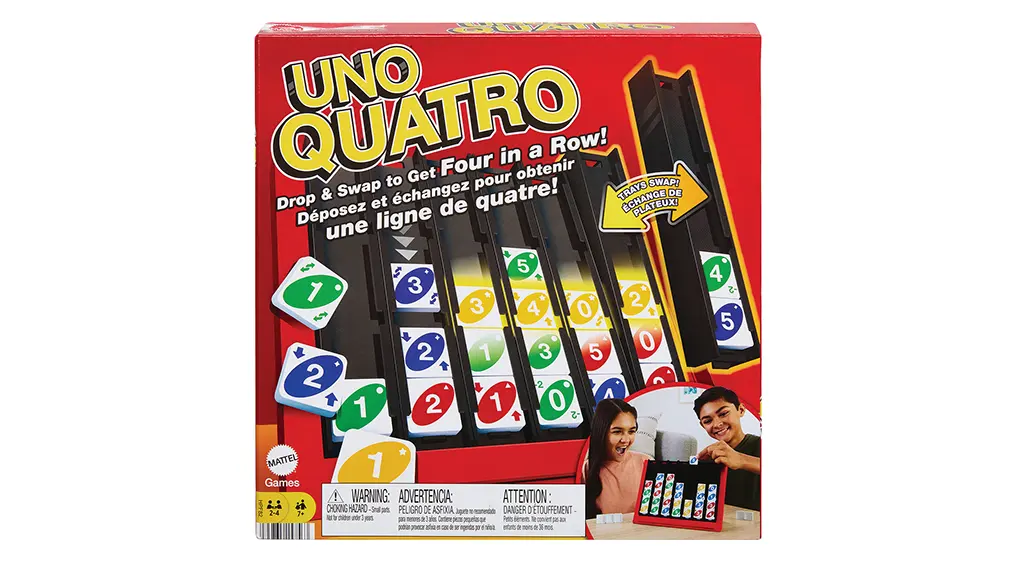 UNO Quatro má skutočný potenciál stať sa najnovším doplnkom rodinných herných večerov.Táto hra kombinuje výzvu párovania farieb alebo čísel s tým, že musíte dosiahnuť štvoricu v rade. Hráči striedavo vsúvajú svoje dlaždice do jednej zo siedmich táck, zatiaľ čo akčné dlaždice zvyšujú výzvu.